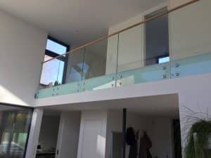 Een paalvrije glazen balustrade die een elegant & open gevoel tussen twee verdiepingen creëert bij onze Duitse klant.